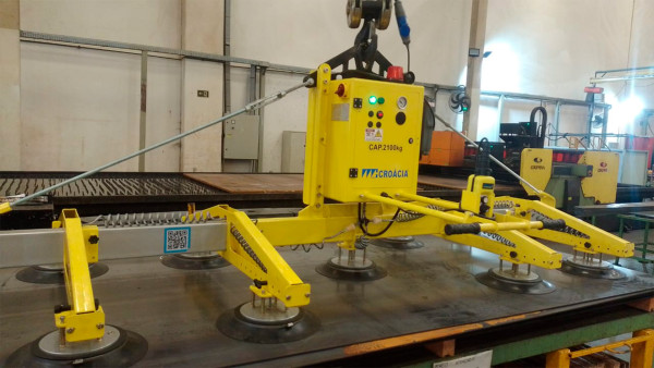 O pegador de chapas com ventosas é um dispositivo compacto a vácuo, projetado para ser engatado em guindastes. Este equipamento, que muitas vezes possui capacidade de rotação e inclinação (tilt), é ideal para a viragem de chapas, permitindo a manipulação de ângulos e planos com facilidade. Além disso, possibilita a inspeção de ambos os lados da chapa, aumentando a eficiência e a segurança nas operações.