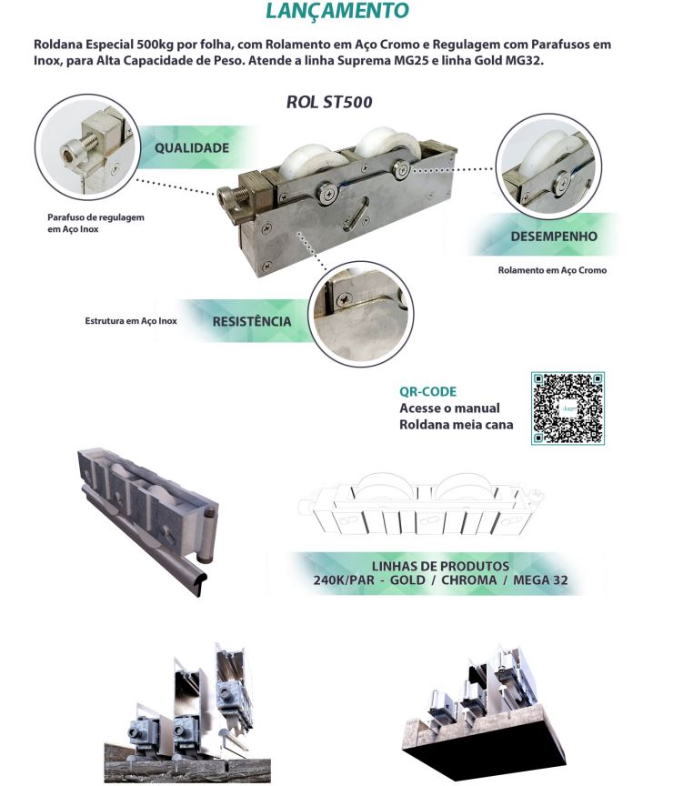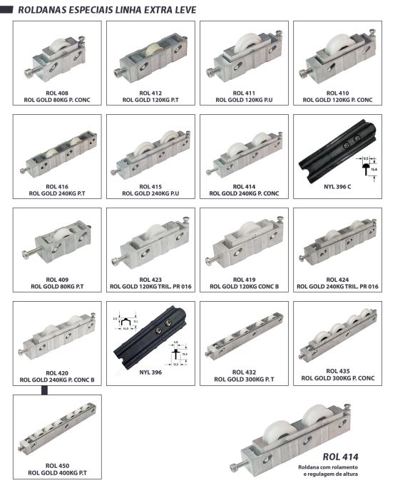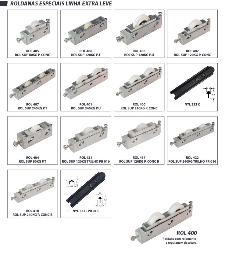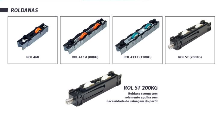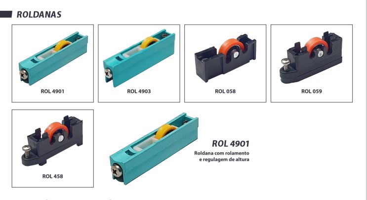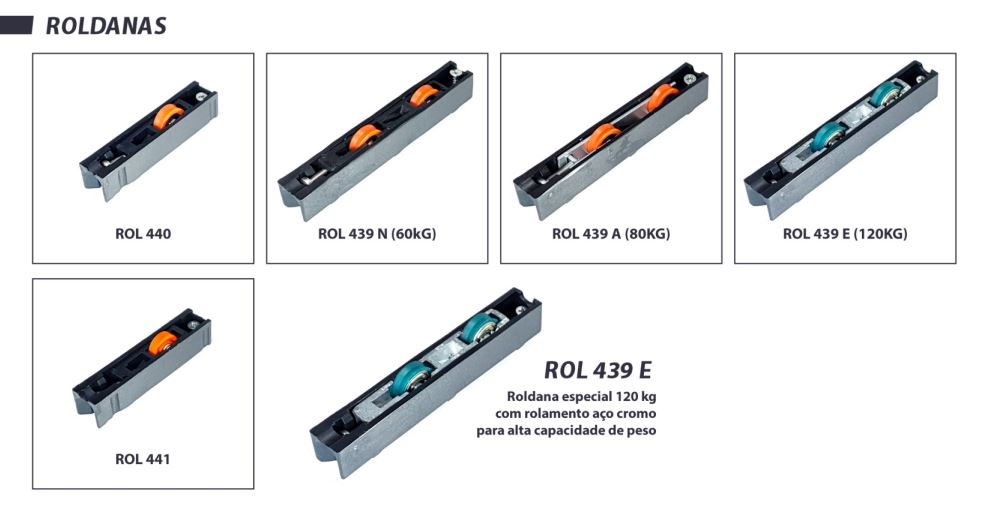Os modelos disponíveis, como ROL 440 (40kg), ROL 439 N (60kg), ROL 439 A (80kg) e ROL 439 E (120kg), oferecem uma regulagem de altura em todos os modelos, permitindo um ajuste fino no alinhamento das esquadrias. O tipo de rolamento pode ser em aço cromo ou agulha, proporcionando um deslizamento suave e silencioso, além de uma instalação e substituição facilitadas.