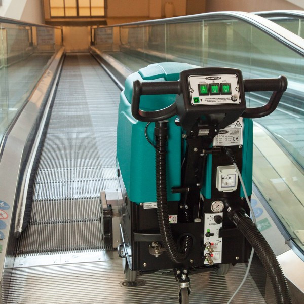 EC52 varre, lava esfrega e seca restaurando o brilho de escadas e esteiras rolantes de qualquer marca. Uma vez na posição, ela funciona automaticamente, varrendo a seco e lavando com uma solução de limpeza nebulizada.