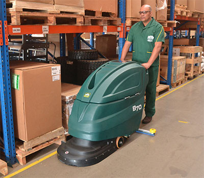 A Lavadora secadora de pisos TENNANT T1 possui uma faixa de limpeza de 38 cm e é perfeita para a limpeza entre passagens, vestiários, corredores de saída, entre outros.