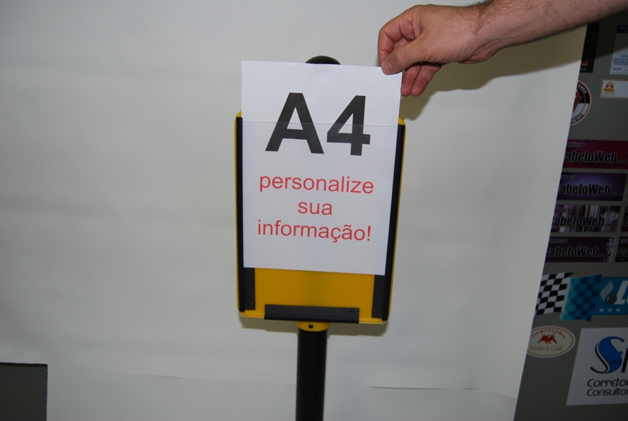 Este pedestal é projetado com uma base e ponteira em polietileno (PE) e um corpo em PVC, com uma base preenchida em concreto, resultando em um peso aproximado de 5,7 kg. As placas são moldadas no formato A4, com uma placa móvel em material transparente e um trilho J em uma das faces, permitindo a colocação de qualquer informação impressa em folha A4, sejam impressos gráficos ou impressões realizadas pelo usuário no dia a dia.